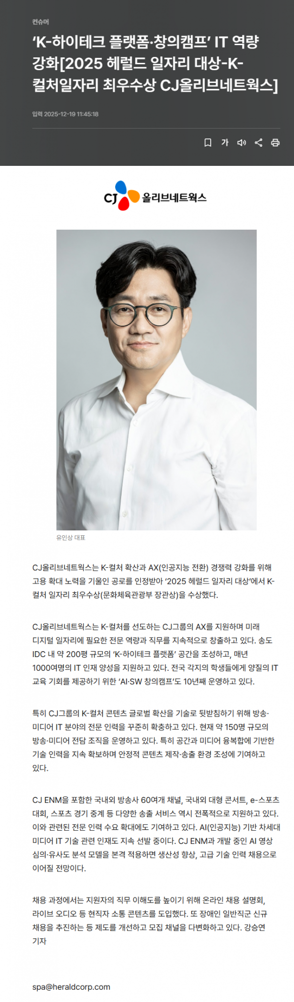 ‘K-하이테크 플랫폼·창의캠프’ IT 역량 강화[2025 헤럴드 일자리 대상-K-컬처일자리 최우수상 CJ올리브네트웍스]