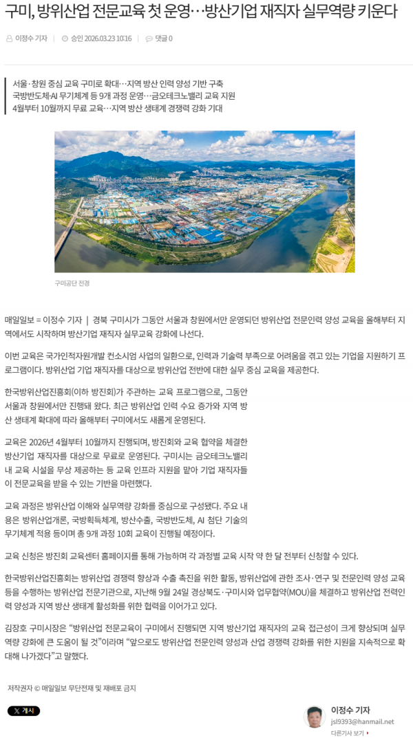 구미, 방위산업 전문교육 첫 운영…방산기업 재직자 실무역량 키운다