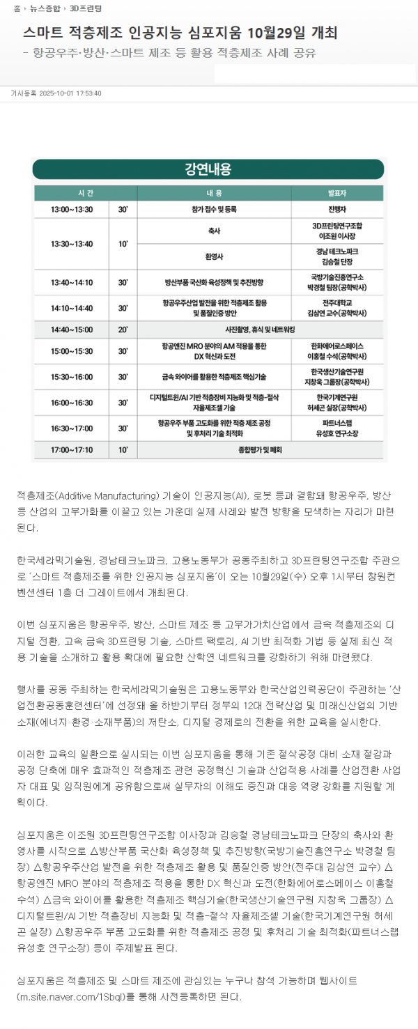 스마트 적층제조 인공지능 심포지움 10월29일 개최