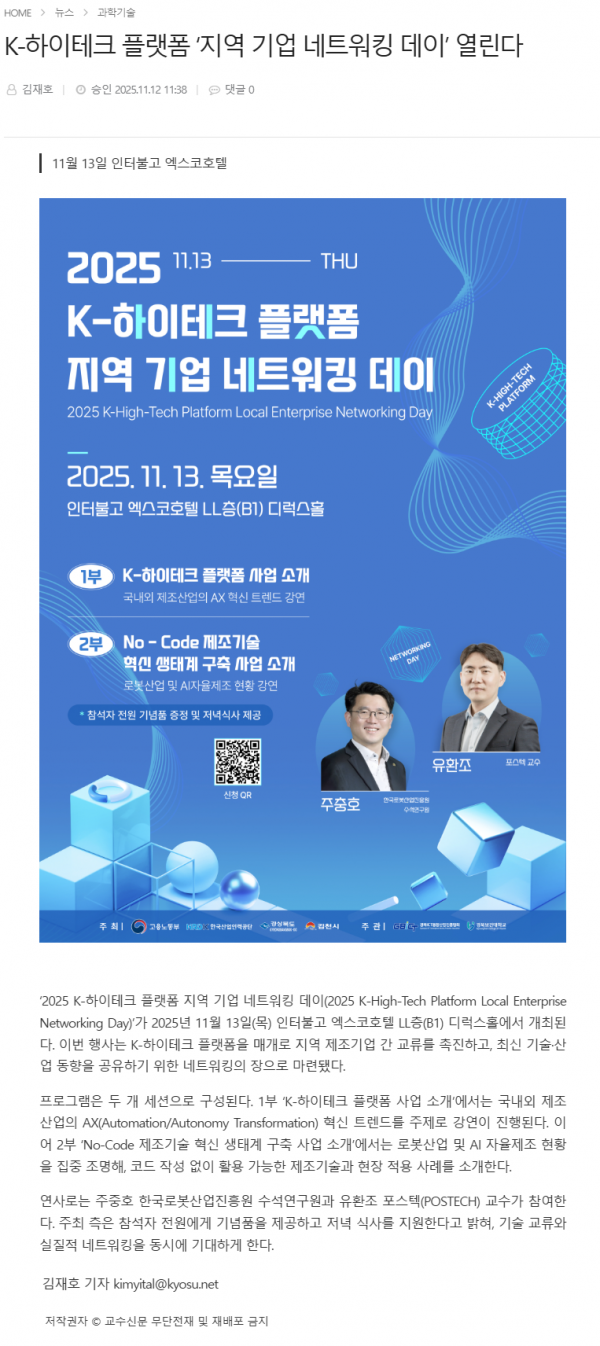 K-하이테크 플랫폼 ‘지역 기업 네트워킹 데이’ 열린다