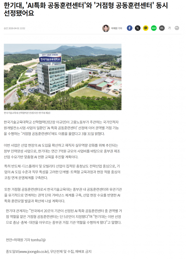 한기대, 'AI특화 공동훈련센터'와 '거점형 공동훈련센터' 동시 선정됐어요