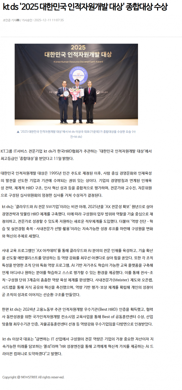 kt ds '2025 대한민국 인적자원개발 대상' 종합대상 수상