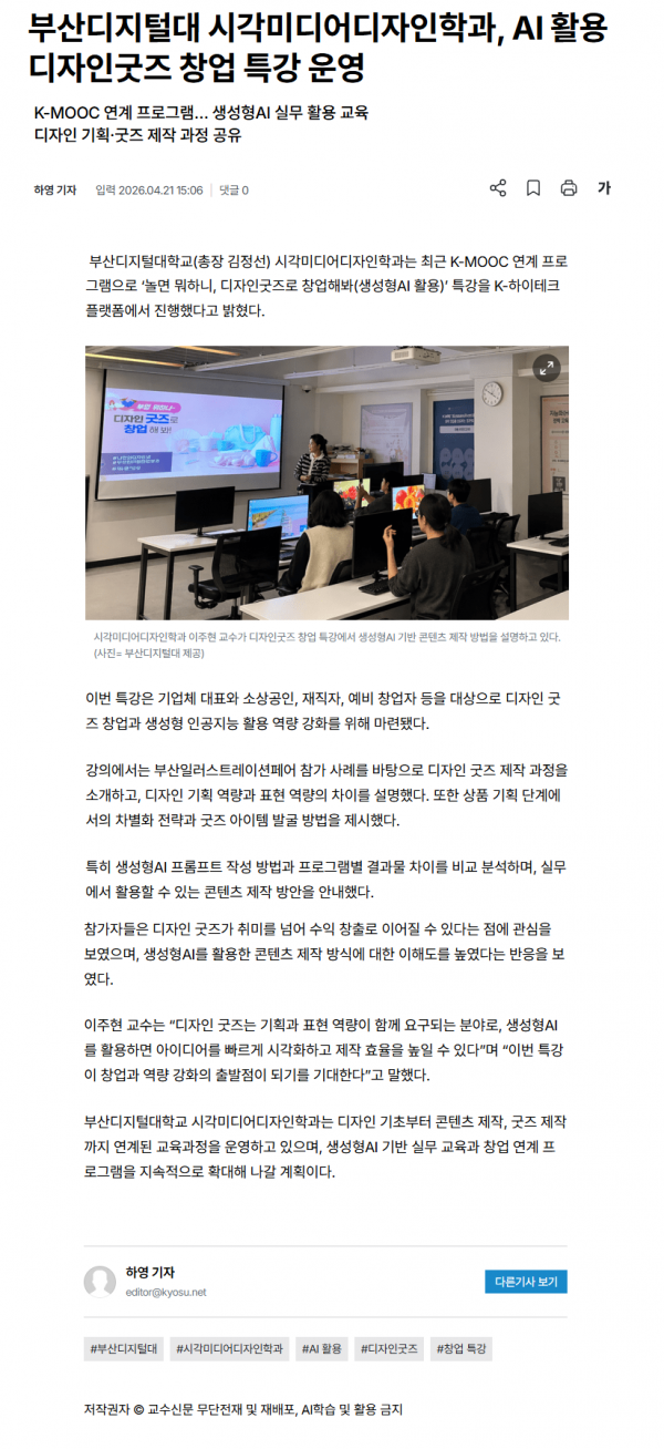 부산디지털대 시각미디어디자인학과, AI 활용 디자인굿즈 창업 특강 운영